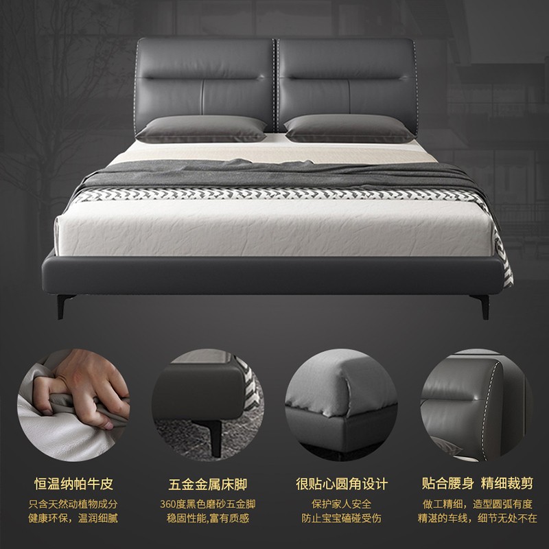 1.恒溫納帕牛皮:只含天然動植物成分,健康環(huán)保,溫潤細膩。 2.五金金屬床腳:360度黑色磨砂五金腳,穩(wěn)固性能,富有質感。 3.貼心圓角設計:保護家人安全,防止寶寶磕碰受傷。 4.貼合腰身,精細裁剪:做工精細,造型圓弧有度,精湛的車線,細節(jié)無處不在。