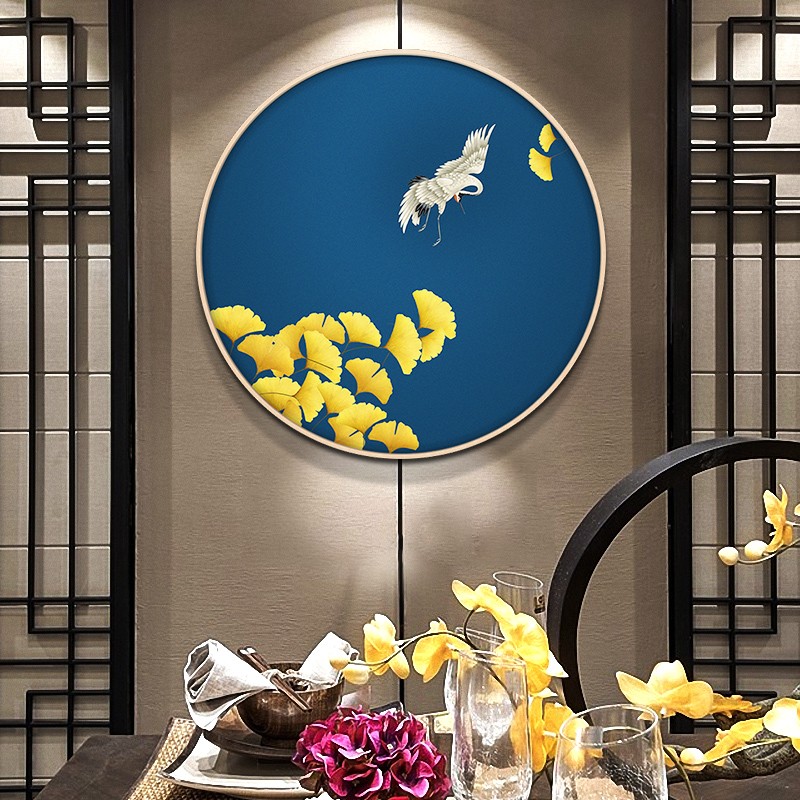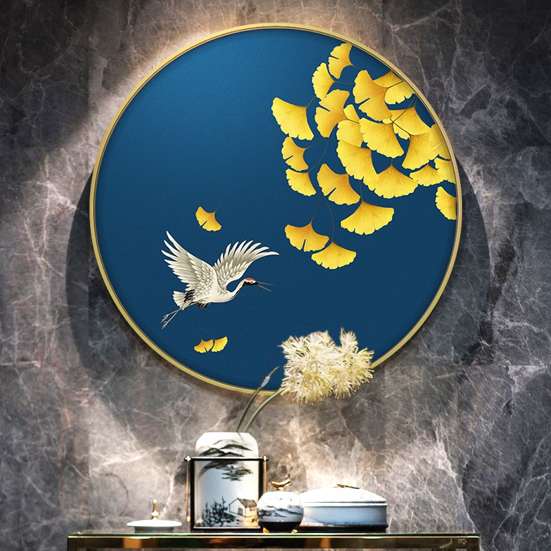 新中式玄關(guān)手繪油畫(huà)走廊壁畫(huà)掛畫(huà)花鳥(niǎo)圓形裝飾畫(huà) 仙鶴送福