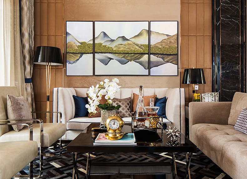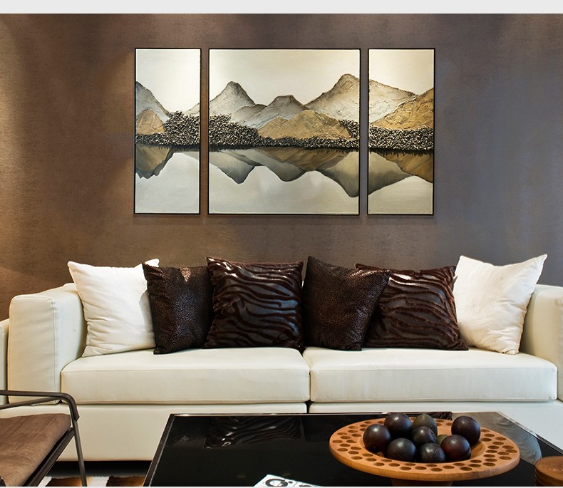 現(xiàn)代簡約沙發(fā)背景墻客廳裝飾畫三聯(lián)掛畫臥室純手繪油畫 湖光山色
