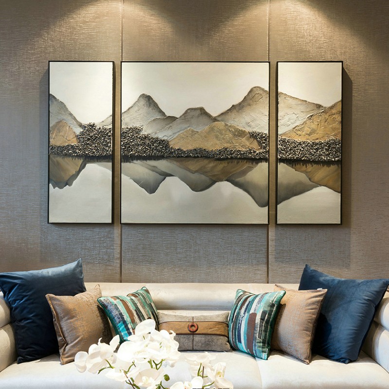 現(xiàn)代簡約沙發(fā)背景墻客廳裝飾畫三聯(lián)掛畫臥室純手繪油畫 湖光山色
