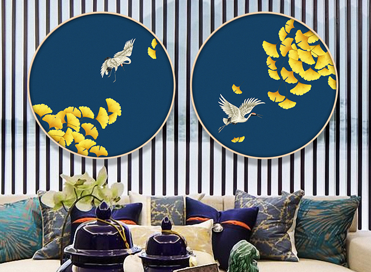 新中式玄關(guān)手繪油畫走廊壁畫掛畫花鳥圓形裝飾畫 仙鶴送福