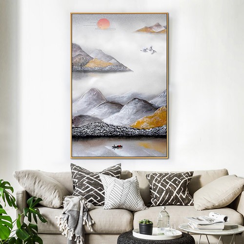 新中式客廳裝飾畫書房原創(chuàng)純手繪山水畫玄關(guān)環(huán)保PS框掛畫 霧中舟