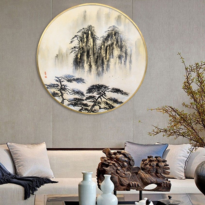 新中式客廳裝飾畫書房原創(chuàng)純手繪山水畫臥室不銹鋼金屬圓框掛畫 迎客松2