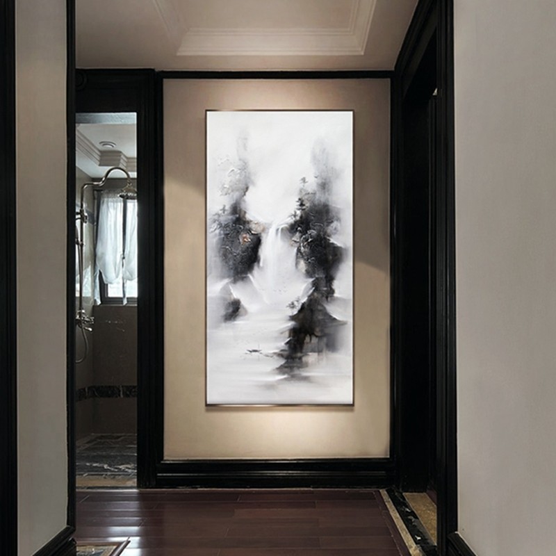 新中式客廳裝飾畫書房原創(chuàng)純手繪山水畫餐廳環(huán)保PS框掛畫 遠(yuǎn)山瀑布