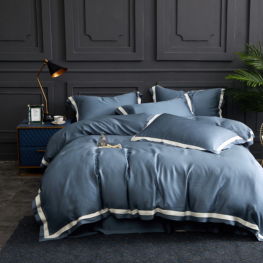 床上用品 純棉四件套 蕾絲工藝 60天絲純色工藝系列 石青