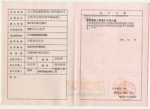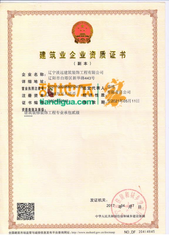 淡遠(yuǎn)裝飾是遼寧省著名商標(biāo)、遼寧省重合同守信用單位,已獲得建筑工程設(shè)計(jì)乙級(jí)資質(zhì)、裝飾裝修施工二級(jí)資質(zhì),獲健康安全證書(shū),信譽(yù)等級(jí)AAA級(jí)、已通過(guò)環(huán)保體系認(rèn)證和ISO9001認(rèn)證。